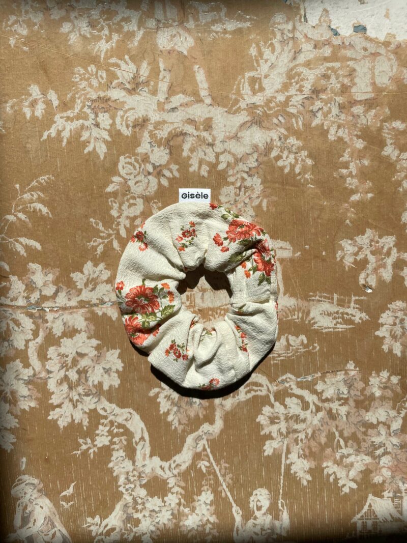 Le chouchou Flora est confectionné en France par les femmes de l’atelier Emmaüs Up dans un coton imprimé fleuri issu de la seconde main et choisi avec soin par Gisèle.