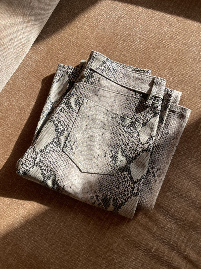 Pantalon patte d’éléphant en cuir imprimé serpent